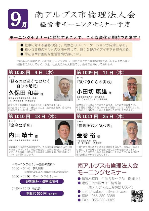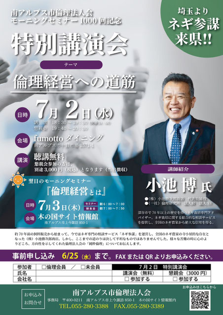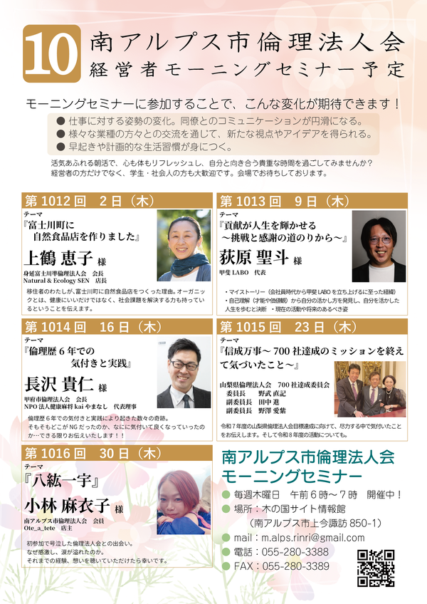 いよいよ、人間力が試される時代に突入しました。AI IOTにより、50%の従来の仕事が無くなり、新しい仕事が生まれようとしております。今だからこそ、人間力を最大限に高める時代です。また、南アルプス市倫理法人会では、この講演会で多くの経営者の人間力を高めるお手伝いをしたいと考えております。